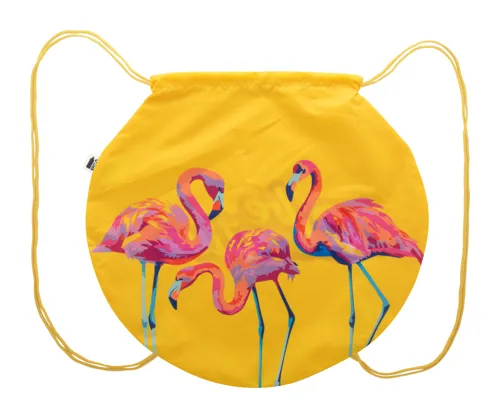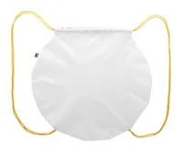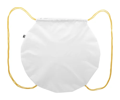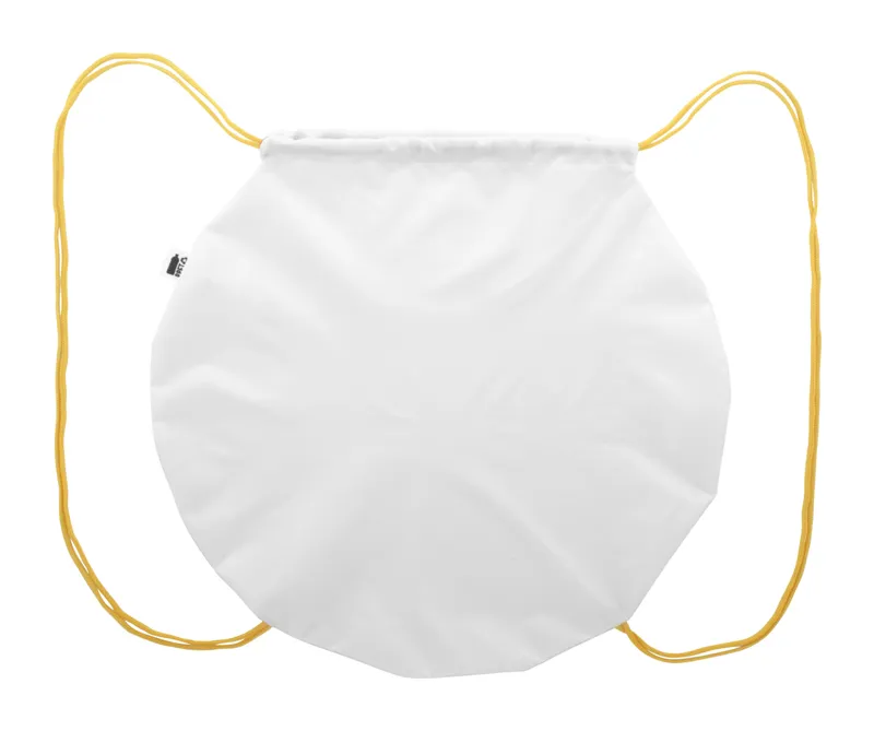 Egyedi gyártású, labda alakú összehúzható hátizsák színes zsinórral, 190T RPET poliészter. Teljes felületén szublimációs nyomtatással ellátva és megkülönböztető RPET címkével. Minimális rendelési mennyiség: 25 db.