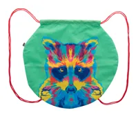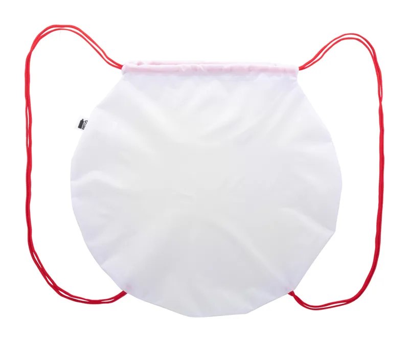 Egyedi gyártású, labda alakú összehúzható hátizsák színes zsinórral, 190T RPET poliészter. Teljes felületén szublimációs nyomtatással ellátva és megkülönböztető RPET címkével. Minimális rendelési mennyiség: 25 db.