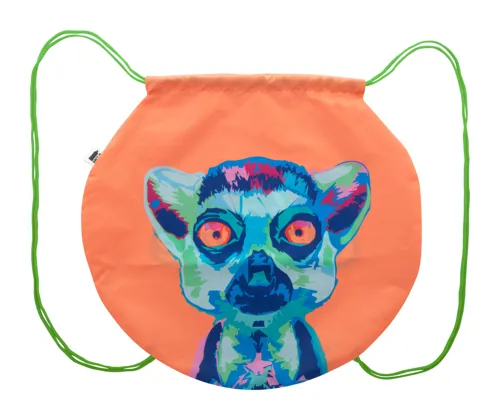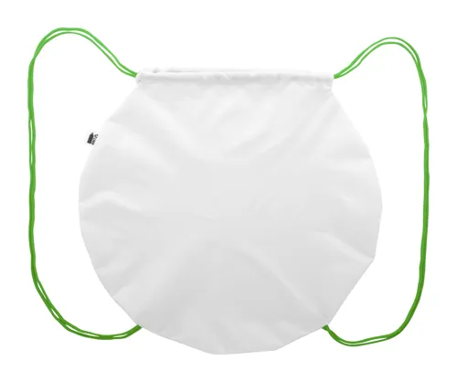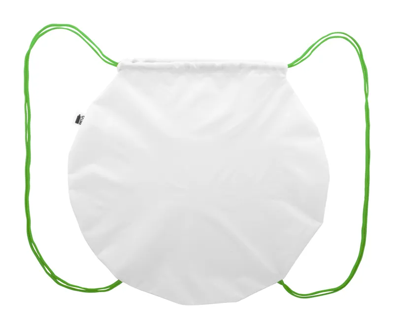 Egyedi gyártású, labda alakú összehúzható hátizsák színes zsinórral, 190T RPET poliészter. Teljes felületén szublimációs nyomtatással ellátva és megkülönböztető RPET címkével. Minimális rendelési mennyiség: 25 db.