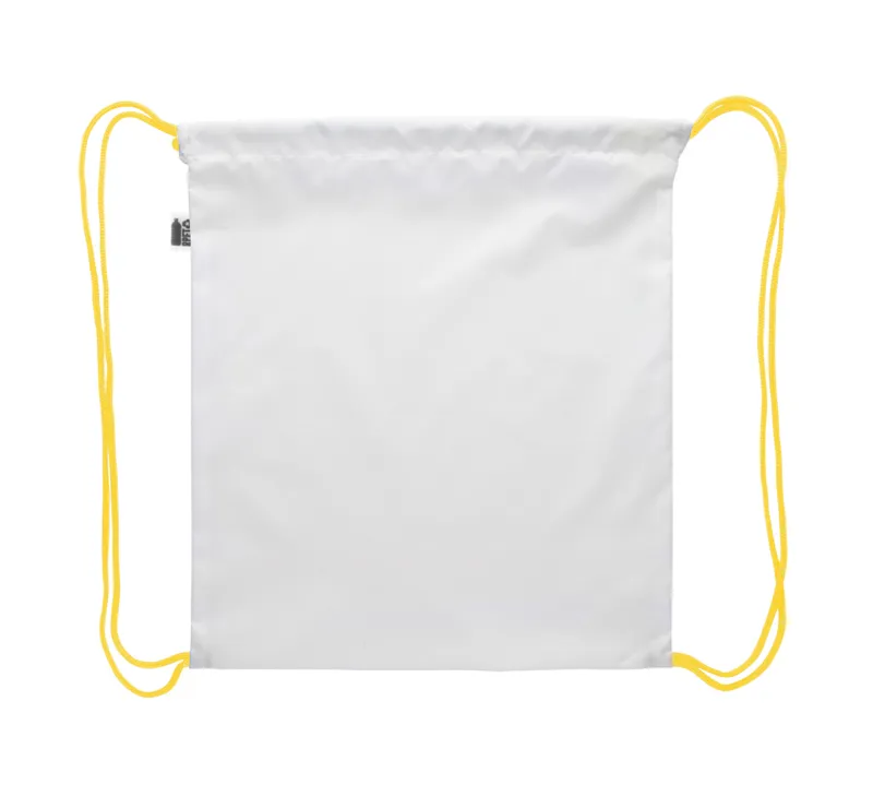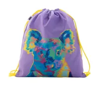Egyedi gyártású gyerek hátizsák színes, zsinórfüles vállpánttal, 190T RPET poliészter. Teljes felületén szublimációs eljárással emblémázva és megkülönböztető RPET címkével. Minimális rendelési mennyiség: 25 db.