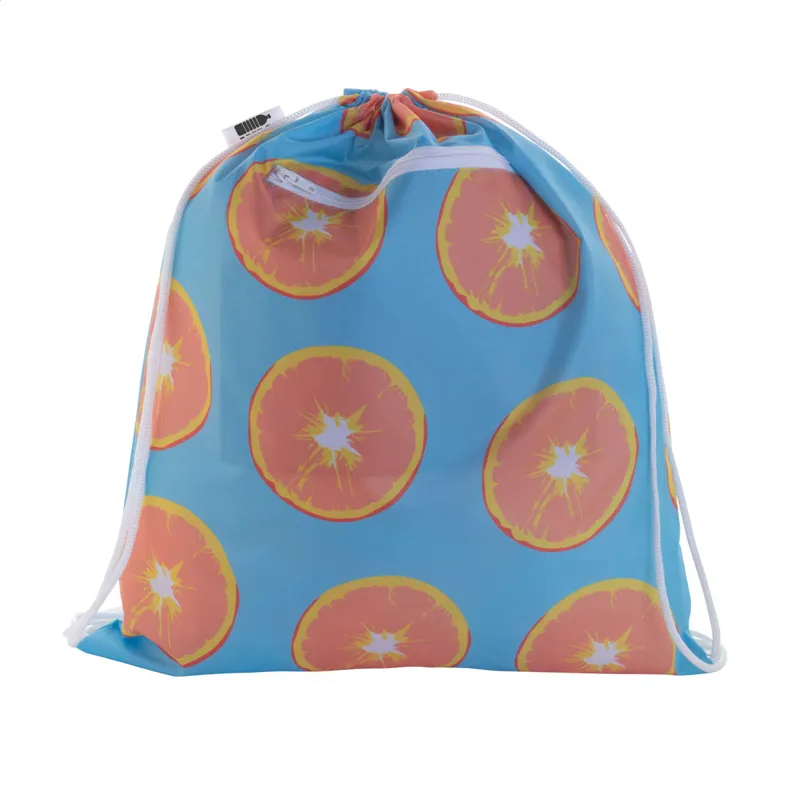 Egyedi gyártású hátizsák RFID védelemmel ellátott elülső zsebbel, 190T RPET poliészter. Teljes felületén szublimációs eljárással emblémázva, megkülönböztető RPET címkével. Minimális rendelési mennyiség: 25 db.