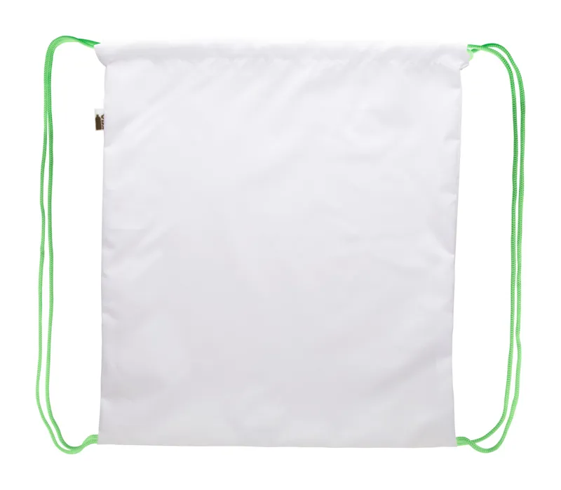 Egyedi gyártású hátizsák színes, zsinórfüles vállpánttal, 190T RPET poliészter. Teljes felületén szublimációs eljárással emblémázva, megkülönböztető RPET címkével. Minimális rendelési mennyiség: 25 db.