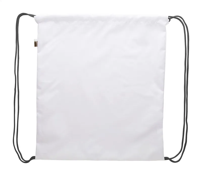 Egyedi gyártású hátizsák színes, zsinórfüles vállpánttal, 190T RPET poliészter. Teljes felületén szublimációs eljárással emblémázva, megkülönböztető RPET címkével. Minimális rendelési mennyiség: 25 db.