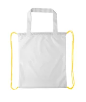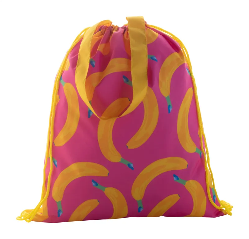 Egyedi gyártású hátizsák színes, zsinórfüles vállpánttal és hosszú hordfüllel, 190T poliészter. Bevásárlótáskaként is használható. Teljes felületén szublimációs eljárással emblémázva. Minimális rendelési mennyiség: 25 db.