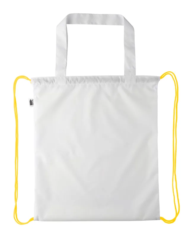 Egyedi gyártású hátizsák színes, zsinórfüles vállpánttal és hosszú hordfüllel, 190T RPET poliészter. Bevásárlótáskaként is használható. Teljes felületén szublimációs eljárással emblémázva és megkülönböztető RPET címkével. Minimális rendelési mennyiség: 25 db.