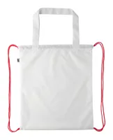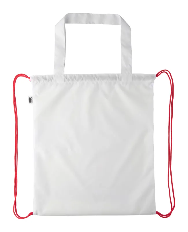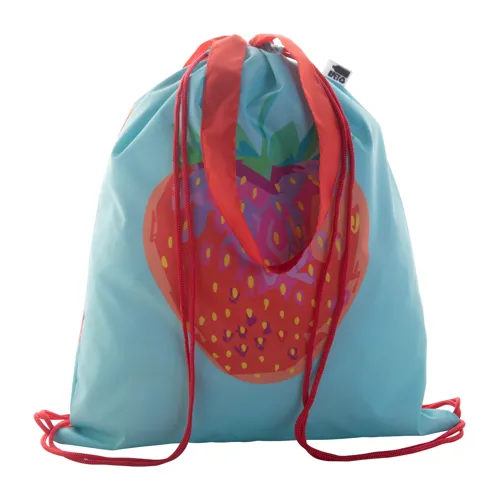 Egyedi gyártású hátizsák színes, zsinórfüles vállpánttal és hosszú hordfüllel, 190T RPET poliészter. Bevásárlótáskaként is használható. Teljes felületén szublimációs eljárással emblémázva és megkülönböztető RPET címkével. Minimális rendelési mennyiség: 25 db.