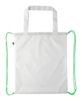 Egyedi gyártású hátizsák színes, zsinórfüles vállpánttal és hosszú hordfüllel, 190T RPET poliészter. Bevásárlótáskaként is használható. Teljes felületén szublimációs eljárással emblémázva és megkülönböztető RPET címkével. Minimális rendelési mennyiség: 25 db.