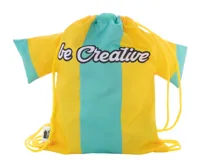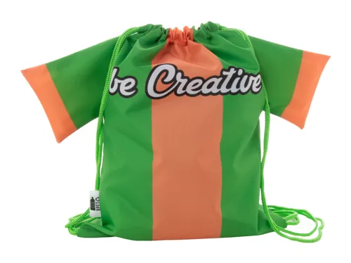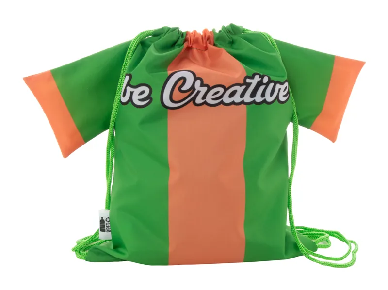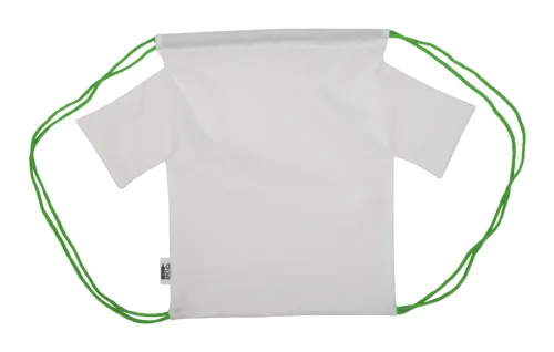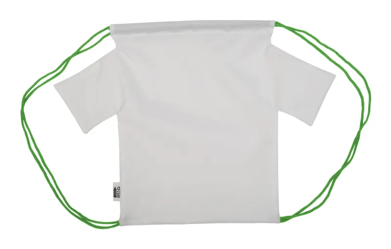 Egyediesíthető, póló alakú gyerek hátizsák színes, zsinórfüles vállpánttal, 190T RPET poliészter. Teljes felületén szublimációs eljárással emblémázható. Megkülönböztető RPET címkével. Minimális rendelési mennyiség: 25 db.