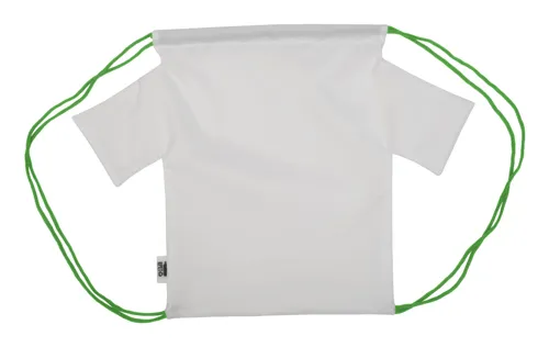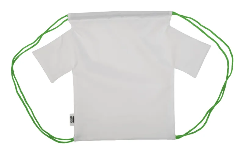 Egyediesíthető, póló alakú hátizsák színes zsinórral, 190T RPET poliészter. Teljes felületén szublimációs eljárással emblémázható, megkülönböztető RPET címkével. Minimális rendelési mennyiség: 25 db.