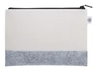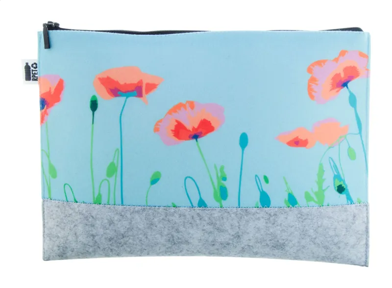 Egyedi gyártású, cipzáras kozmetikai táska RPET filcből, teljes felületén szublimációs nyomtatással. Megkülönböztető RPET címkével. Minimális rendelési mennyiség: 50 db.