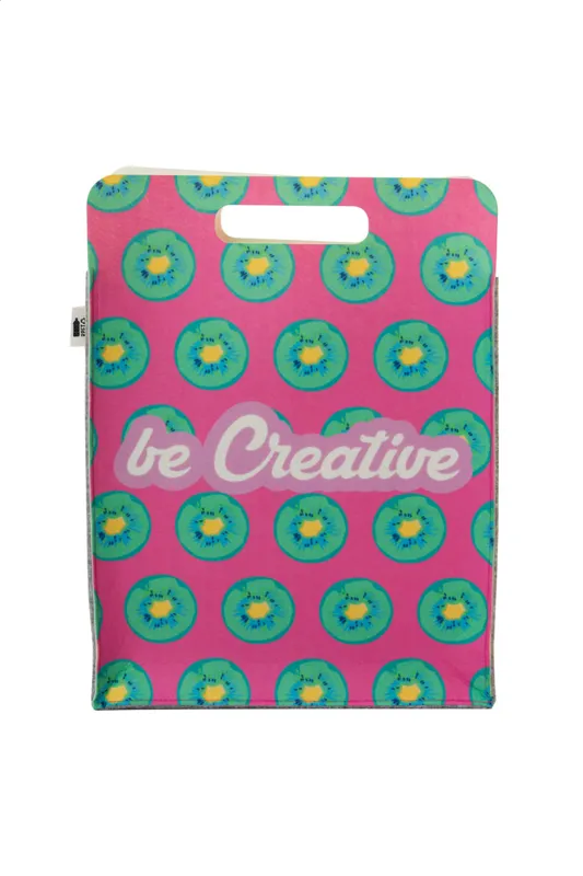 Egyedi gyártású, RPET filc bevásárlótáska full-colour emblémázható elő-és hátoldallal. Piskótafülekkel, betoldással és megkülönböztető RPET címkével. Az ár tartalmazza a szublimációs emblémázást. Minimális rendelési mennyiség: 25 db.