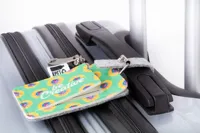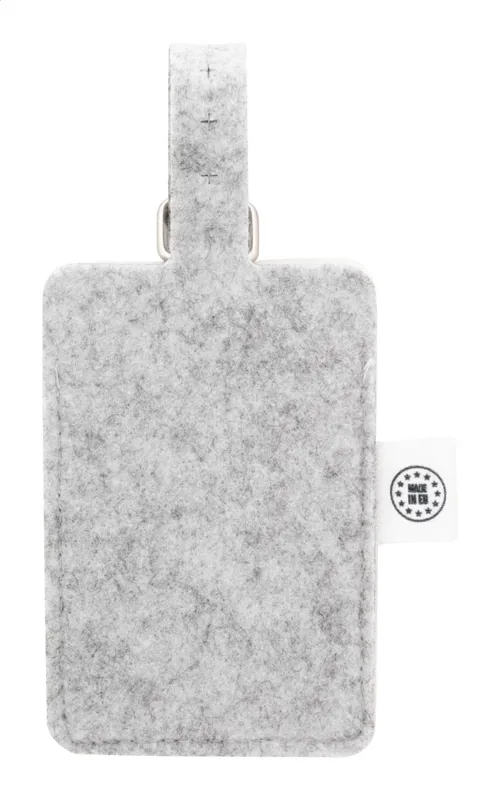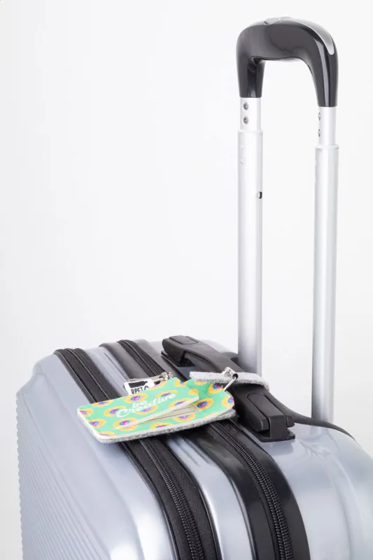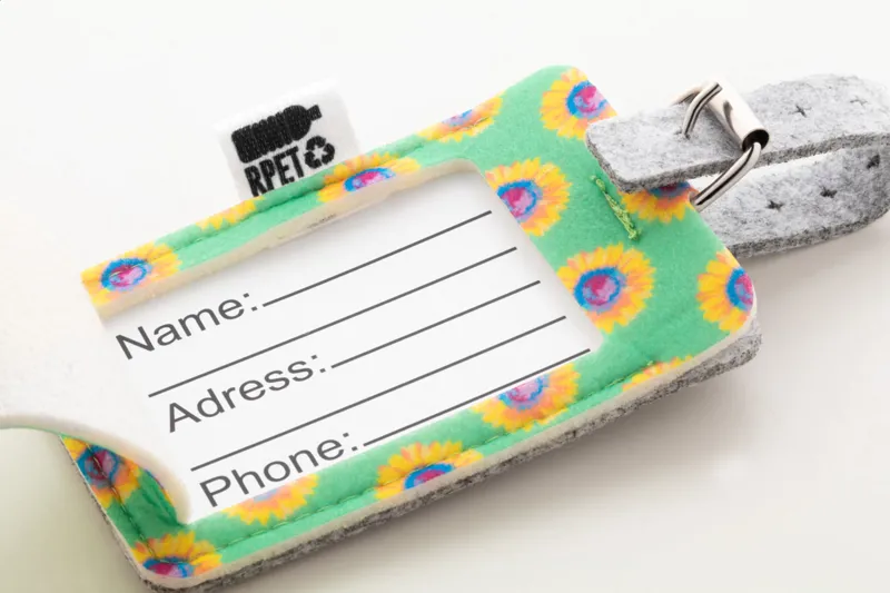 Egyedi gyártású, RPET filc bőröndcímke full-colour emblémázható előlappal, csatos zárással és papírbetéttel. Megkülönböztető RPET címkével. Az ár tartalmazza a szublimációs emblémázást. Minimális rendelési mennyiség: 50 db.