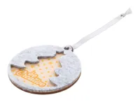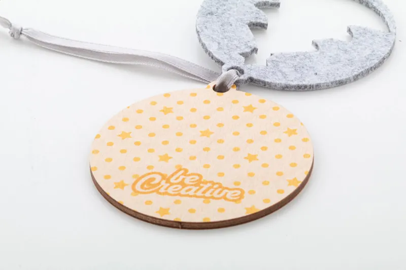 Egyedi gyártású, kétrétegű, RPET filcből és rétegelt nyírfából készült karácsonyfadísz ezüst szalaggal, a felső rétegén kivágott karácsonyi mintával. Az ár tartalmazza az UV LED nyomtatást az alsó rétegen. Minimális rendelési mennyiség: 100 db.