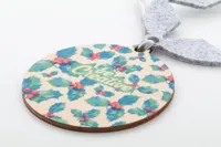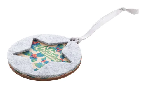 Egyedi gyártású, kétrétegű, RPET filcből és rétegelt nyírfából készült karácsonyfadísz ezüst szalaggal, a felső rétegén kivágott karácsonyi mintával. Az ár tartalmazza az UV LED nyomtatást az alsó rétegen. Minimális rendelési mennyiség: 100 db.