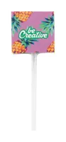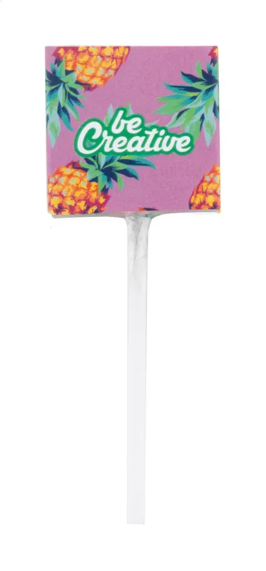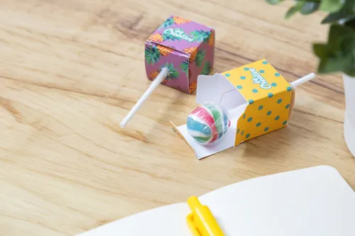 Gyümölcsös nyalóka (8 g) egyedi gyártású, full colour nyomott papírdobozban. Minimális rendelési mennyiség: 100 db