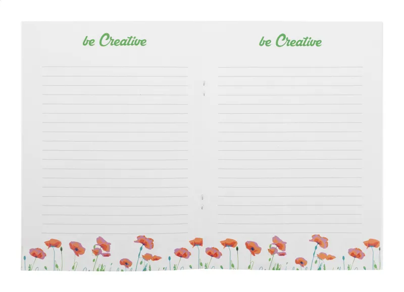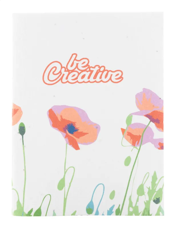 Egyedi gyártású, magpapírral borított jegyzetfüzet 32 újrahasznosított papírlappal, A5 méretű. Az ár tartalmazza a full-colour nyomtatott külső borítót és a belső oldalak azonos full-colour nyomtatását. Minimális rendelési mennyiség: 100 db. Válogatott vadvirág magvakkal.