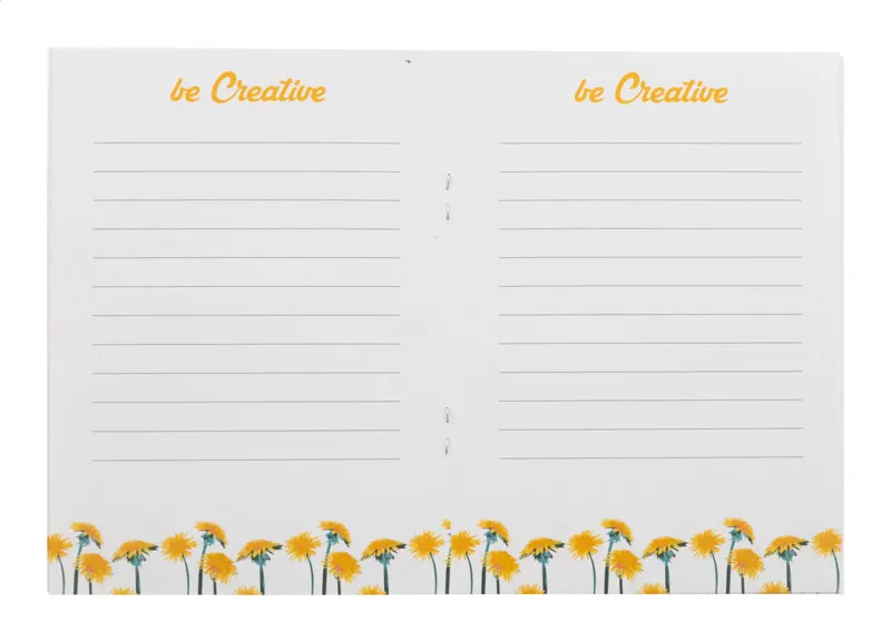 Egyedi gyártású, magpapírral borított jegyzetfüzet 32 újrahasznosított papírlappal, A6 méretű. Az ár tartalmazza a full-colour nyomtatott külső borítót és a belső oldalak azonos full-colour nyomtatását. Minimális rendelési mennyiség: 100 db. Válogatott vadvirág magvakkal.