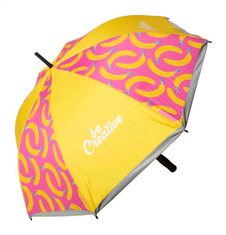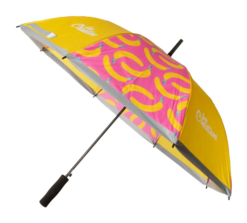 Egyediesíthető, 8 paneles automata esernyő fényvisszaverő díszítéssel, fém szárral, üvegszálas bordákkal és EVA fogantyúval. 190T RPET pongee. Megkülönböztető RPET címkével, minden panelen szublimációs eljárással emblémázható. Minimális rendelési mennyiség: 50 db. A termék kizárólag promóciós célra alkalmas, nem minősül egyéni védőfelszerelésnek.