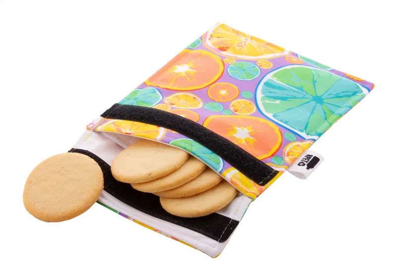 Egyediesíthető, újrafelhasználható 600D RPET poliészterből készült uzsonnás tasak, tartós vízálló béléssel és tépőzárral. Ideális rágcsálnivalók vagy szendvicsek csomagolására. Az ár tartalmazza a szublimációs eljárás költségét a termék teljes felületén. Minimális rendelési mennyiség: 25 db.
