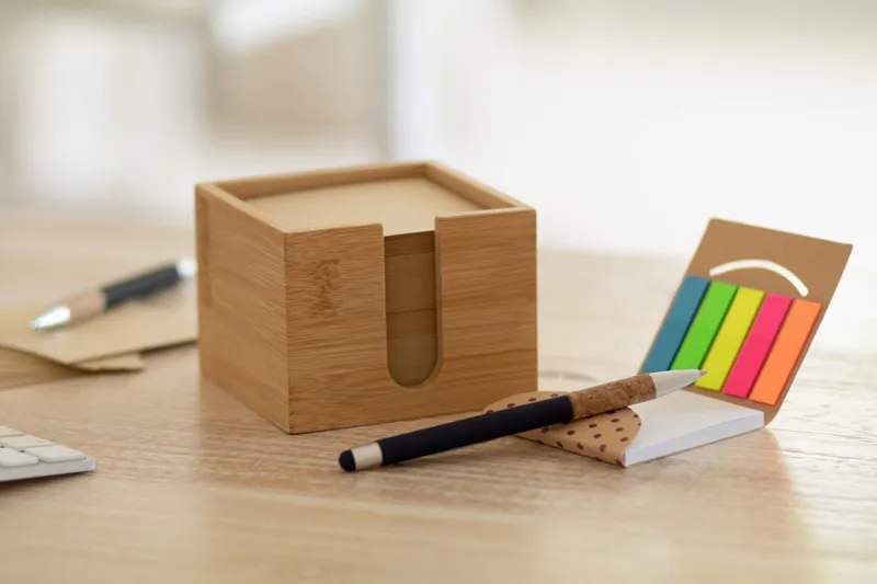 Egyediesíthető, újrahasznosított kraft papírral borított öntapadós jegyzettömb. Tartalmaz 50 újrahasznosított papír öntapadós jegyzetlapot (75×75 mm) és 100 műanyag fólia oldaljelölőt 5 különböző színben (44×12 mm). Az ár tartalmazza a külső borító full-colour nyomtatását. Minimális rendelési mennyiség: 100 db.