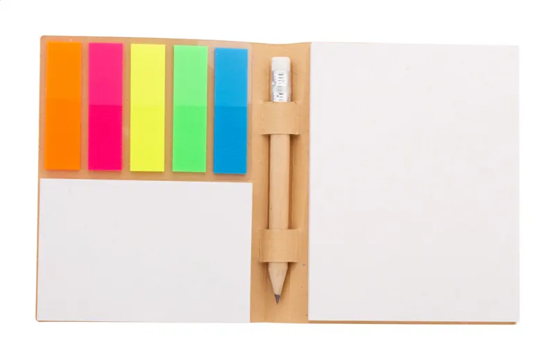 Egyediesíthető, újrahasznosított kraft papírral borítású öntapadós jegyzettömb mini fa ceruzával. Újrahasznosított papírból készült öntapadós lapokkal 2 méretben (50 db 100×75 mm-es, 25 db 50×75 mm-es lap) és 100 műanyag oldaljelölővel 5 különböző színben (12×44 mm). Az ár tartalmazza a full colour nyomtatást a külső borítón. Minimális rendelési mennyiség: 100 db.