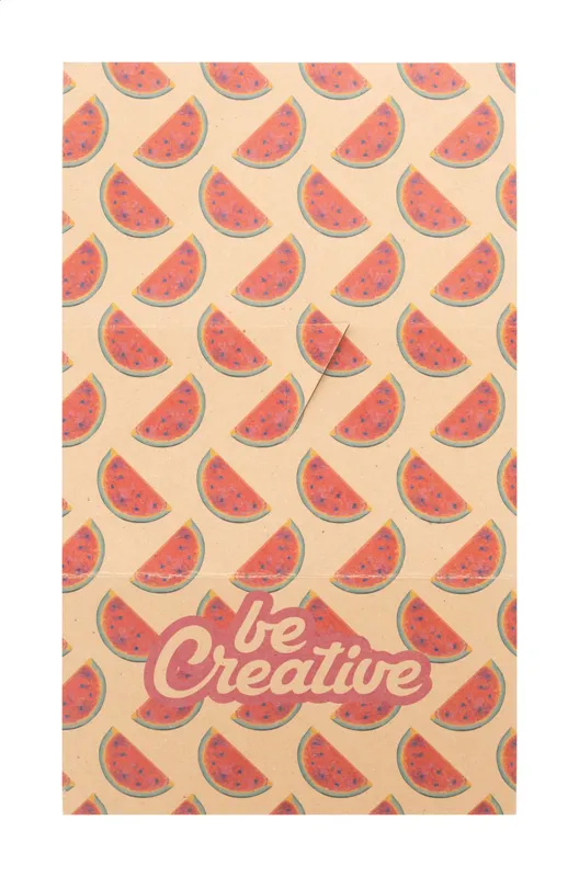 Egyedi gyártású kraft papír jegyzetadagoló függőleges fejléccel. 50 újrahasznosított papírból készült cetlit (75×75 mm) és 100 műanyag oldaljelölőt tartalmaz, 5 különböző színben (44×12 mm). Az ár tartalmazza a teljes színes nyomtatást a fejlécre. Minimális rendelési mennyiség: 100 db.