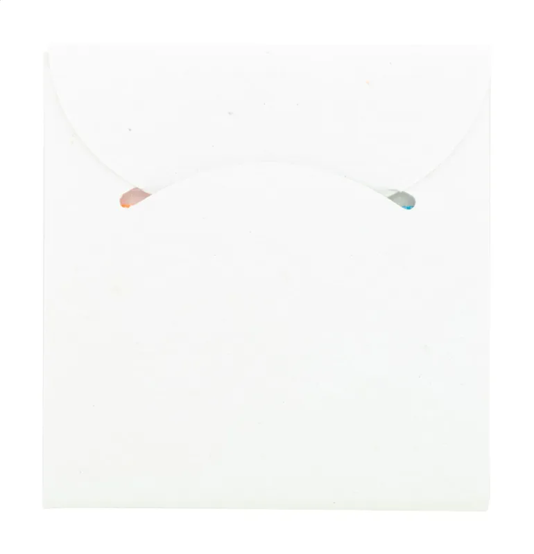 Egyediesíthető, magpapírral borított öntapadós jegyzettömb. Tartalmaz 50 újrahasznosított papír öntapadós jegyzetlapot (75×75 mm) és 100 műanyag fólia oldaljelölőt 5 különböző színben (44×12 mm). Az ár tartalmazza a külső borító full-colour nyomtatását. Minimális rendelési mennyiség: 100 db. Válogatott vadvirágmagokkal.