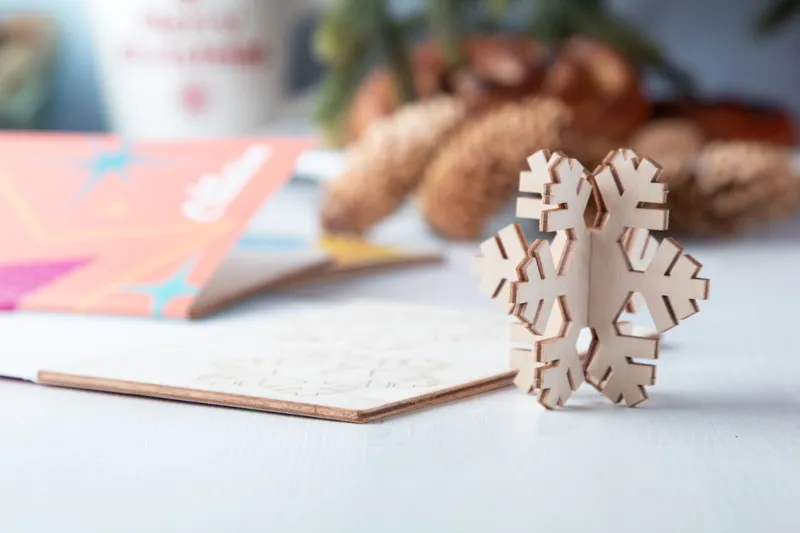 Egyedi grafikával, papírból és fából készült karácsonyi üdvözlőlap összerakható karácsonyi asztaldísszel. Mindkét oldalon egyedileg grafikázható. C6 borítékkal szállítjuk. Minimum rendelési mennyiség: 100 db.