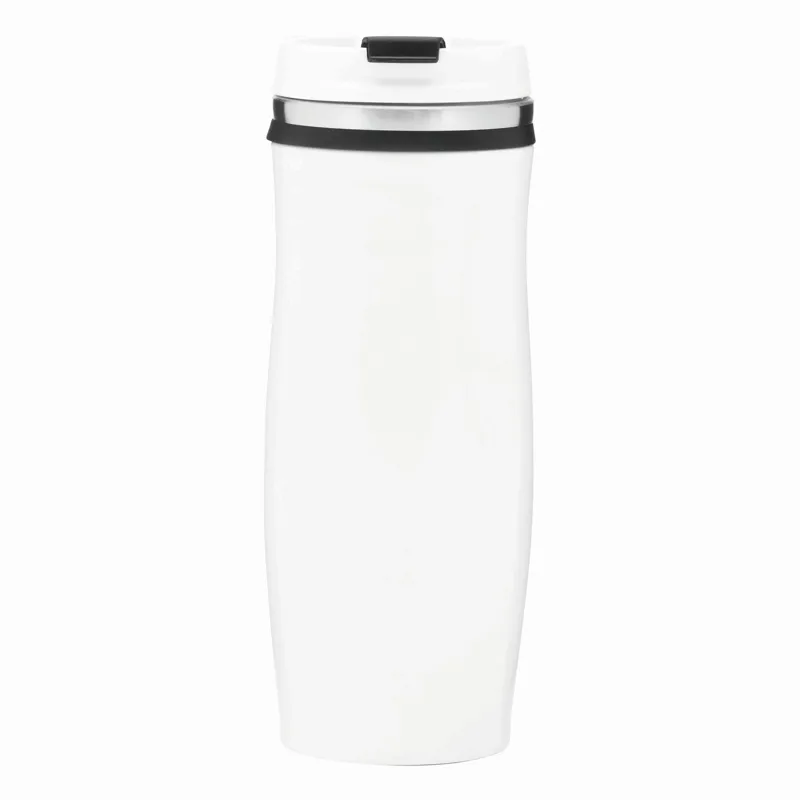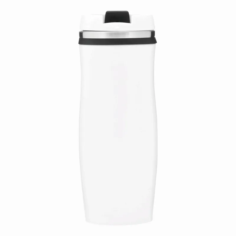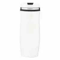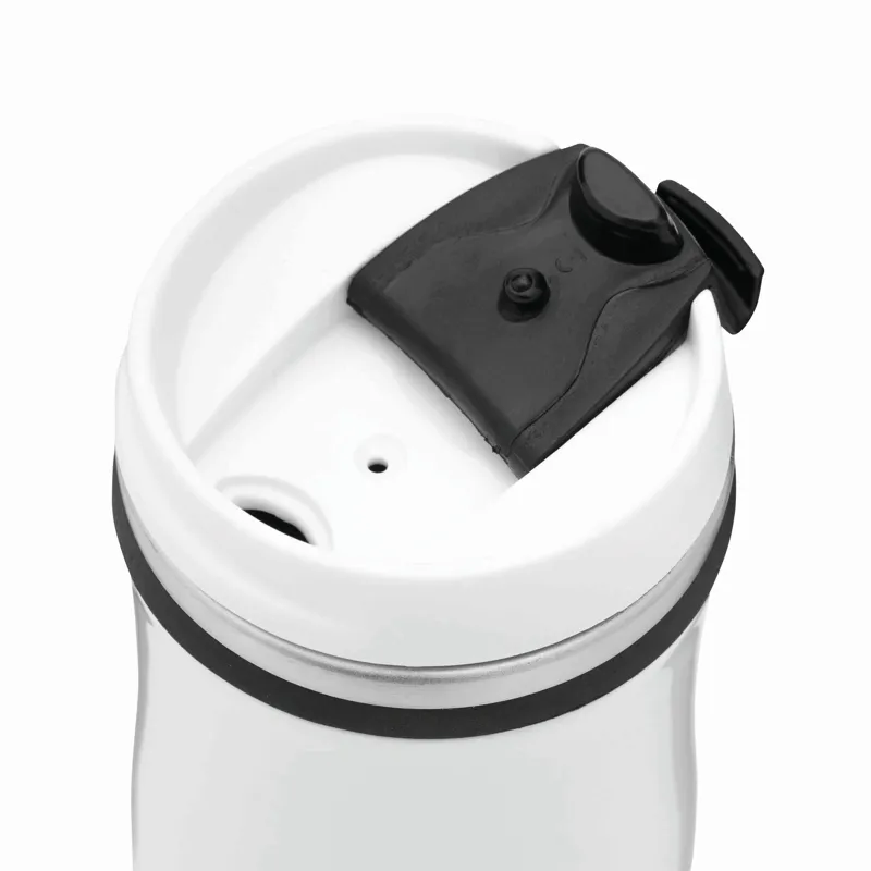 CREMA duplafalú termobögre kívül és belül rozsdamentes acélból, letekerhető műanyag tetővel és beépített, kihajtható nyílással, színes gumigyűrűvel az oldalán és a nyílásán, kb. 400 ml kapacitással