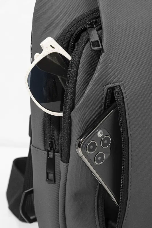 Vízálló RPET oldaltáska cipzáras zsebekkel, csatos zárral és párnázott hátrésszel. Állítható vállpánttal, bal és jobb oldali pozícióba állítható. PU bőr bevonatú 600D RPET poliészter, megkülönböztető RPET címkével.