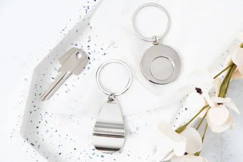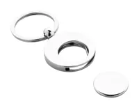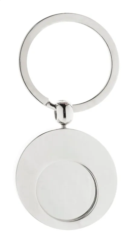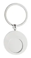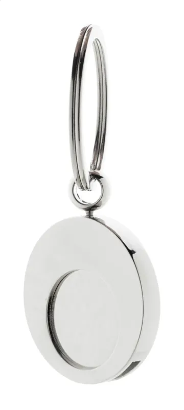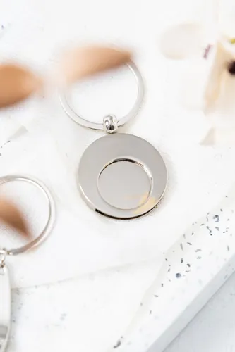 Kerek fém kulcstartó bevásárlókocsi érmével. Kraft papír dobozban.
