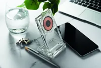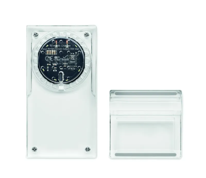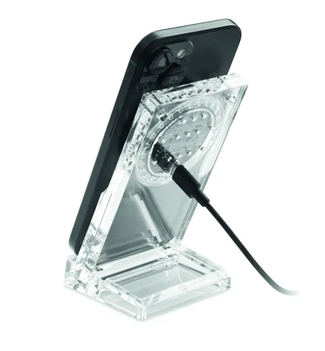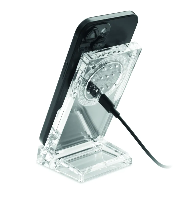 Mágneses, 15W vezeték nélküli töltő akrilból, telefonállvánnyal. Áramforráshoz csatlakoztatva vezeték nélkül tölti fel mobilkészülékét. Kimenet: 9V/1,67A (15W) a gyors töltéshez.
