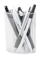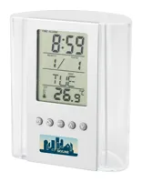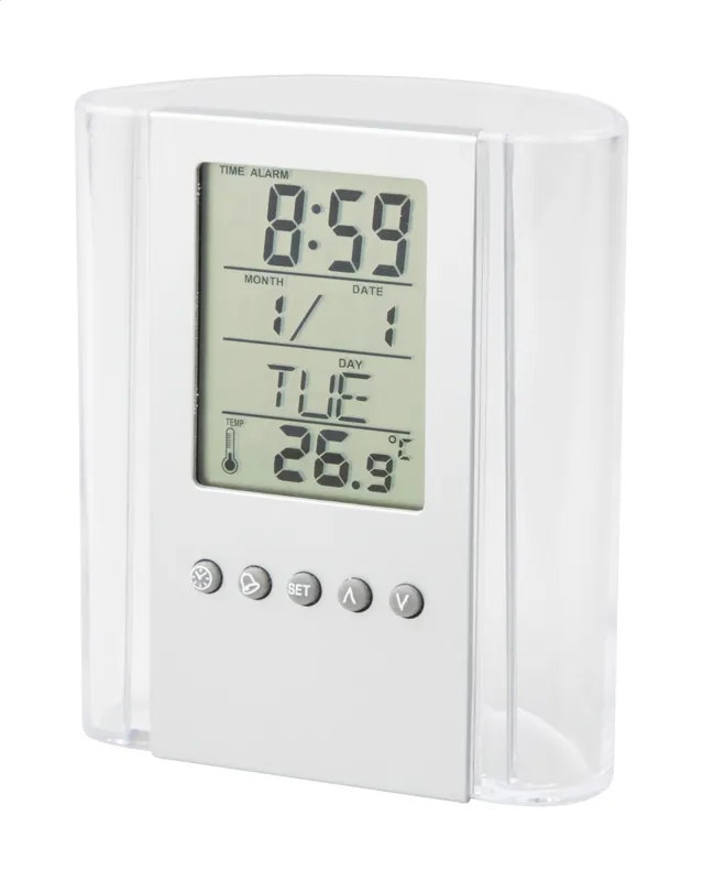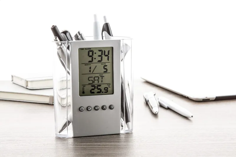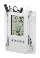 Átlátszó, műanyag tolltartó, digitális kijelzővel, (a kijelző rész levehető) mely mutatja az időt, hőmérsékletet, dátumot. Ébresztő funkciója is van. Elemmel szállítjuk.