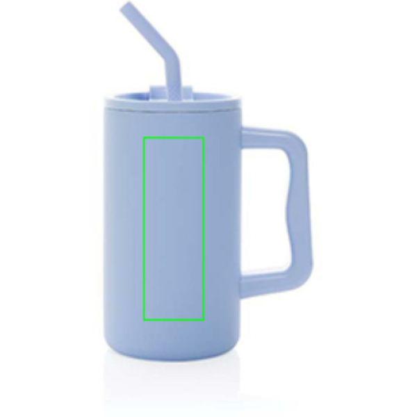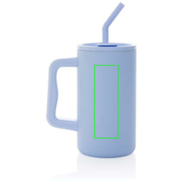 Nagyméretű, 800 ml-es bögrénk tökéletes az íróasztalra. Masszív fogantyúja és széles talpa ideálissá teszi a napi folyadékbevitelhez. A tartós, újrahasznosított rozsdamentes acélból készült, masszív, duplafalú, vákuumszigetelt bögre biztonságos fedéllel, szívószállal és szilikon szívószálheggyel. Forró és jéghideg italokhoz egyaránt használható. A csavaros fedél kettős funkciót kínál - kényelmes ivónyílást vagy a szívószál használatának lehetőségét. Az optimális ápolás érdekében javasoljuk a kézzel történő mosást.