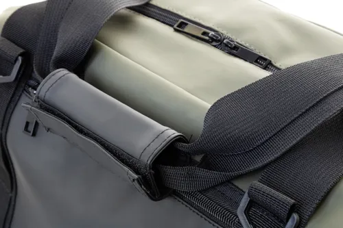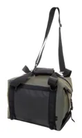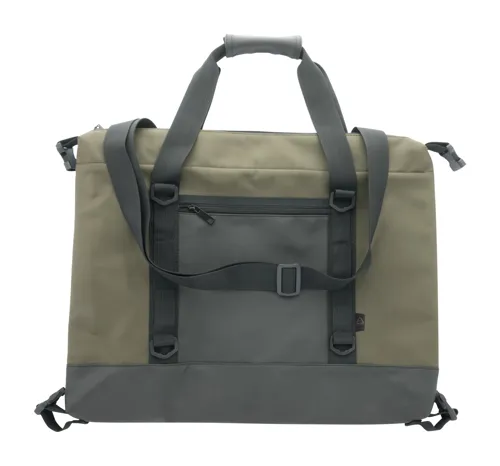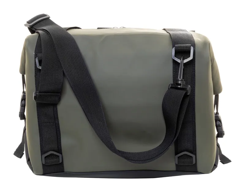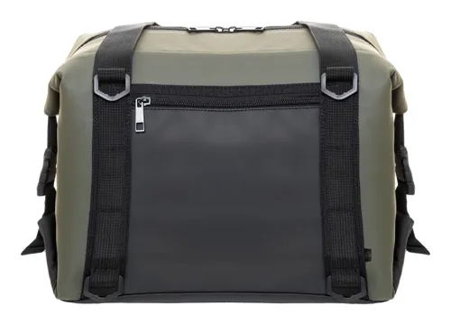 Cipzáras, összecsukható hűtőtáska puha újrahasznosított PU bőrből, alumínium béléssel és cipzáras első zsebbel. Oldalsó csatokkal, fogantyúkkal és állítható vállpánttal. A táska laposra hajtható a könnyebb tárolás érdekében, vagy használat közben az oldalsó csatokkal rögzíthető.