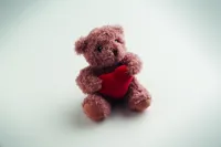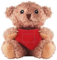 Poliészter plüss mackó piros szívvel a kezében, hímzett szemekkel, orral és szájjal.