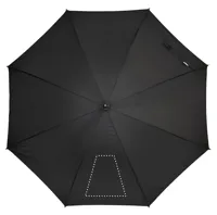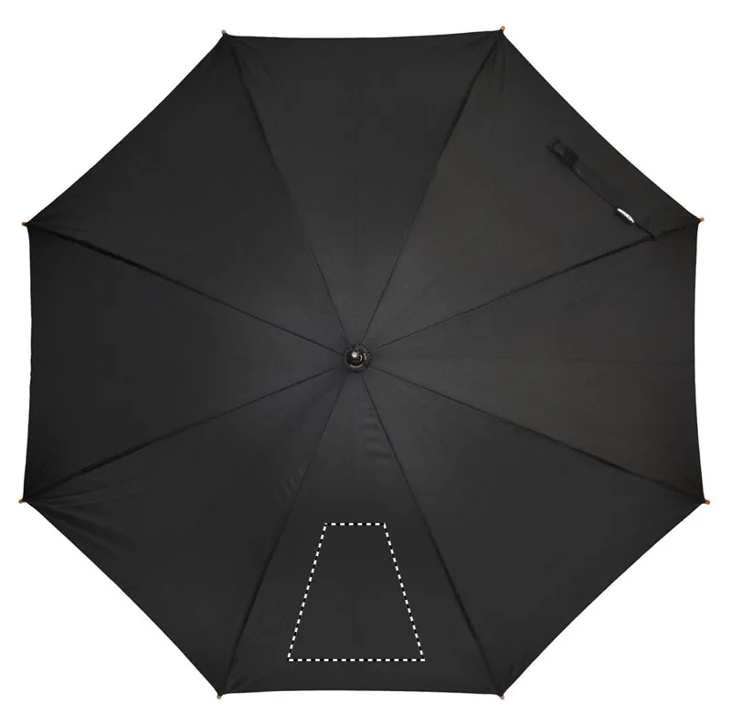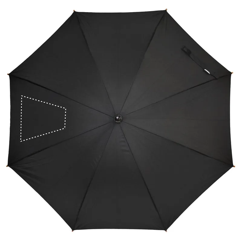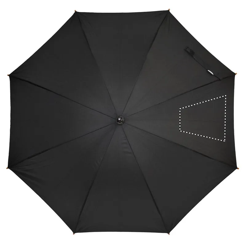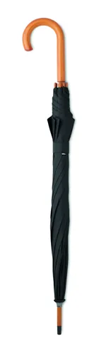 23 colos automatikus nyitású esernyő 190T RPET nyersselyem anyagból, fa rúddal, fa cikkelyzáró elemekkel és csúccsal, feketére festett fém vázzal. Görbített természetes fa markolattal, kézi záródással.