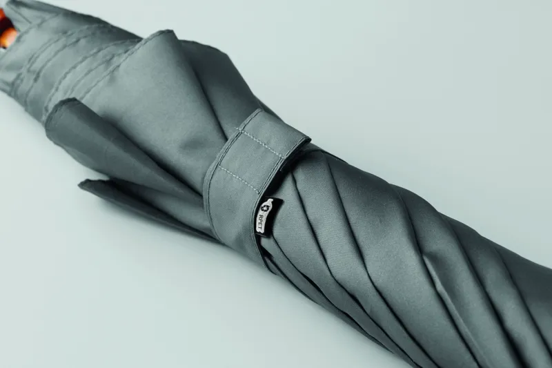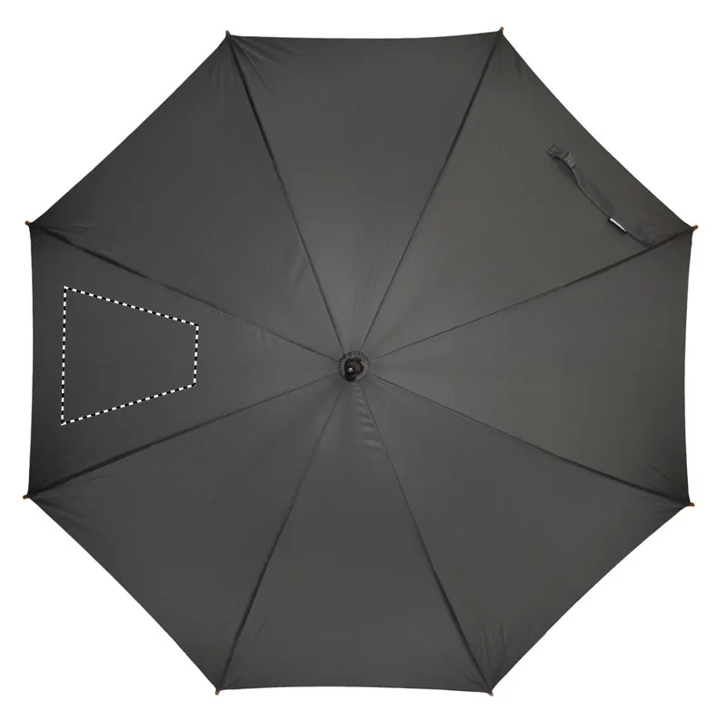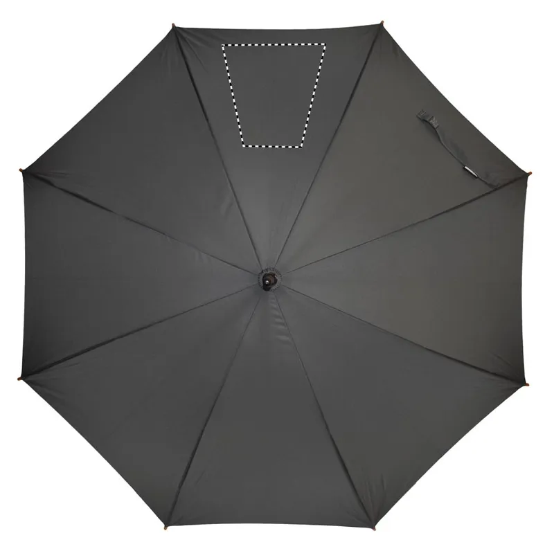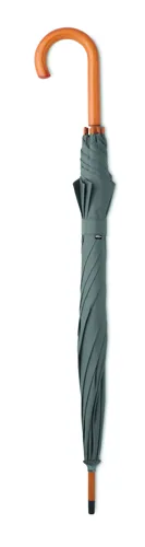 23 colos automatikus nyitású esernyő 190T RPET nyersselyem anyagból, fa rúddal, fa cikkelyzáró elemekkel és csúccsal, feketére festett fém vázzal. Görbített természetes fa markolattal, kézi záródással.