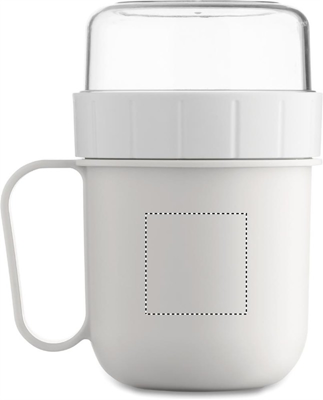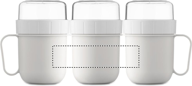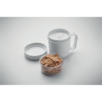 Reggeliző- vagy úti bögre PP-ből, PS tartállyal. A két külön rekeszben elkülöníthetők a hozzávalók. Szivárgásmentes. Űrtartalom: 450 ml és 160 ml.