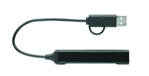 4 portos USB hub újrahasznosított alumíniumból. 3 USB-A + 1 C-típusú. Bemenet: 2 az 1-ben C-típusú és USB-A. Kábel hossza: 19 cm.