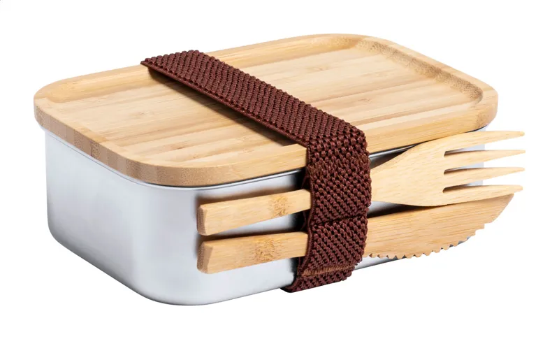 Rozsdamentes acél uzsonnás doboz, természetes bambusz tetővel. Evőeszköz szettel (villa és kanál) és gumipánttal.