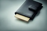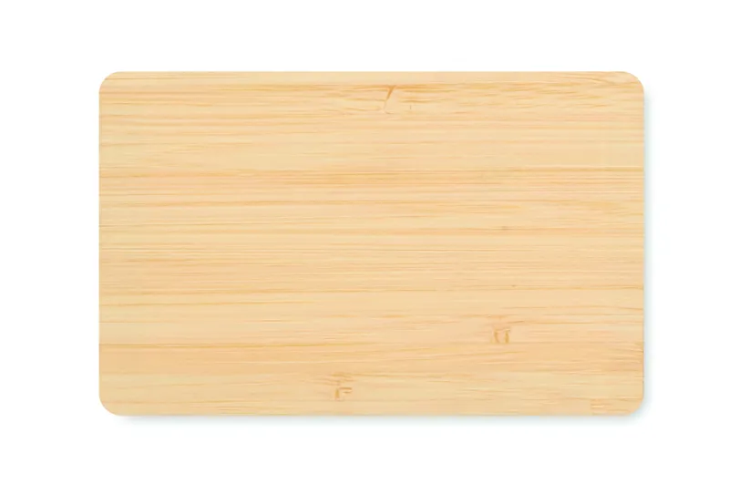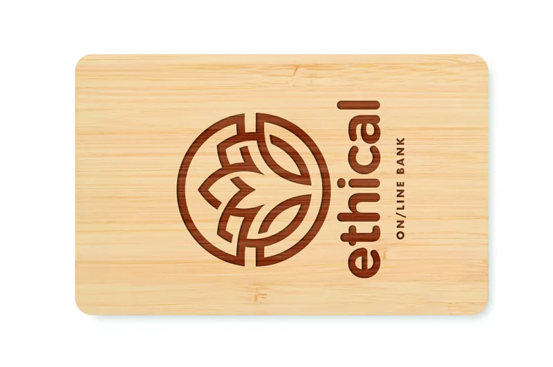 RFID skimmelésgátló kártya bambusz házban. Elektromágneses mező kibocsátásával minden 13.56 mHz-es működő kártya (bank- és hitelkártyák, egyéb bérletek, stb.) skimmelését gátolja a körötte levő 2-3 cm-es területen. A bambusz természetes anyag, színében, mintázatában és méretében esetenként eltérő lehet.