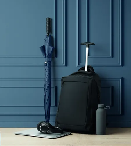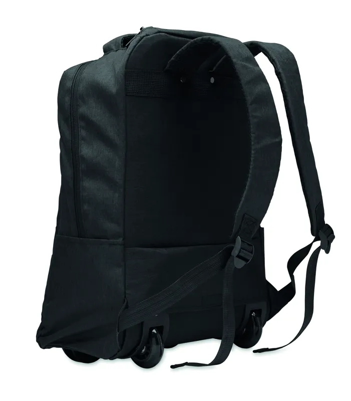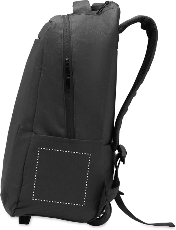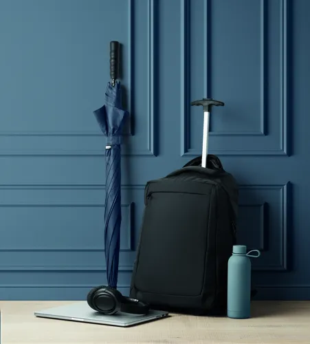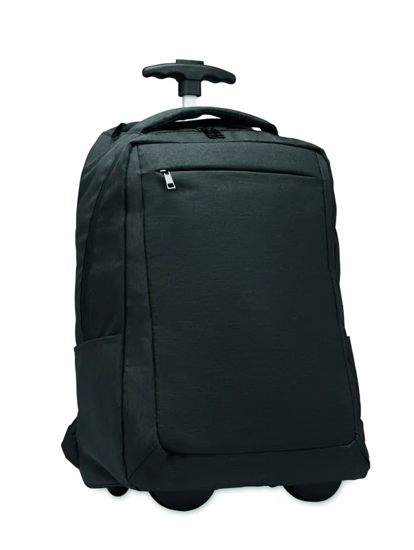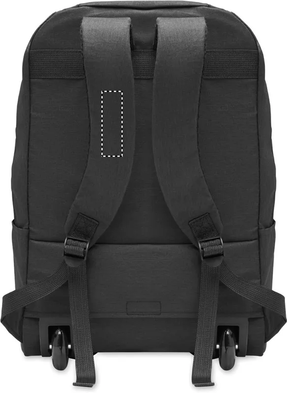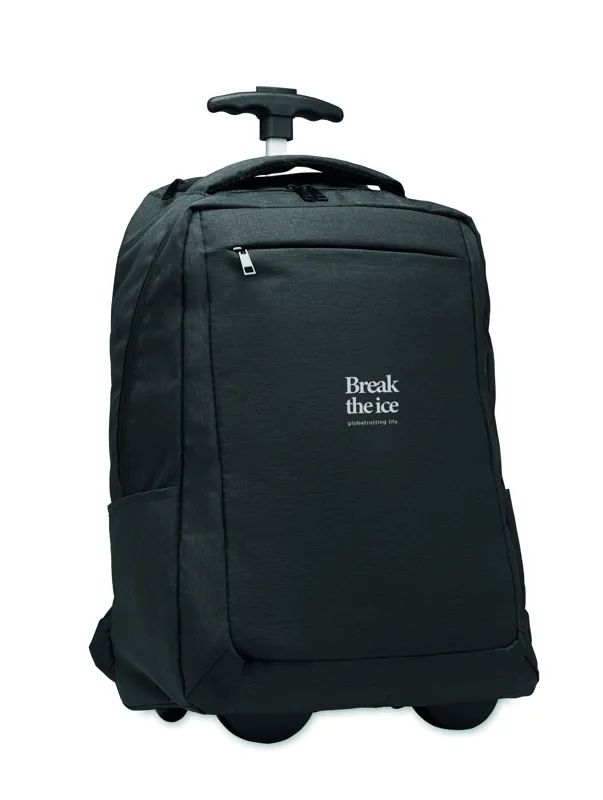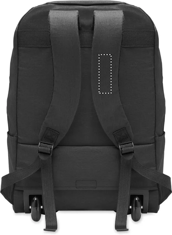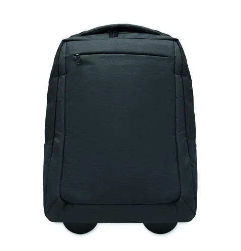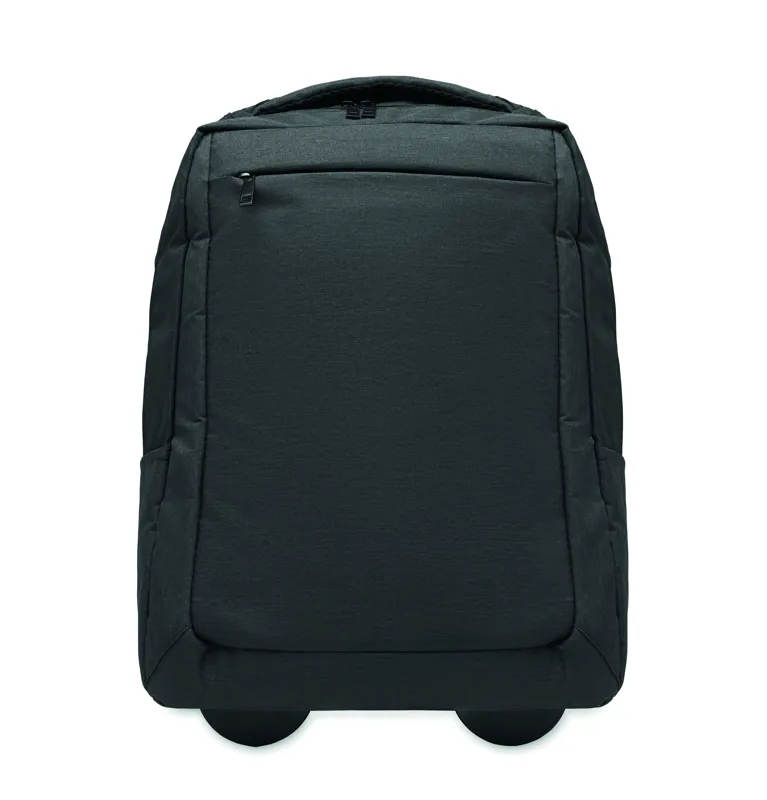 Gurulós laptop hátizsák 600D RPET poliészterből. Egy belső 15 colos laptop rekesz. Cipzáras elülső zseb. Két oldalsó nyitott zseb. Három belső nyitott zseb. Párnázott hát- és vállpántok. 2 kerék és dupla csőváz.