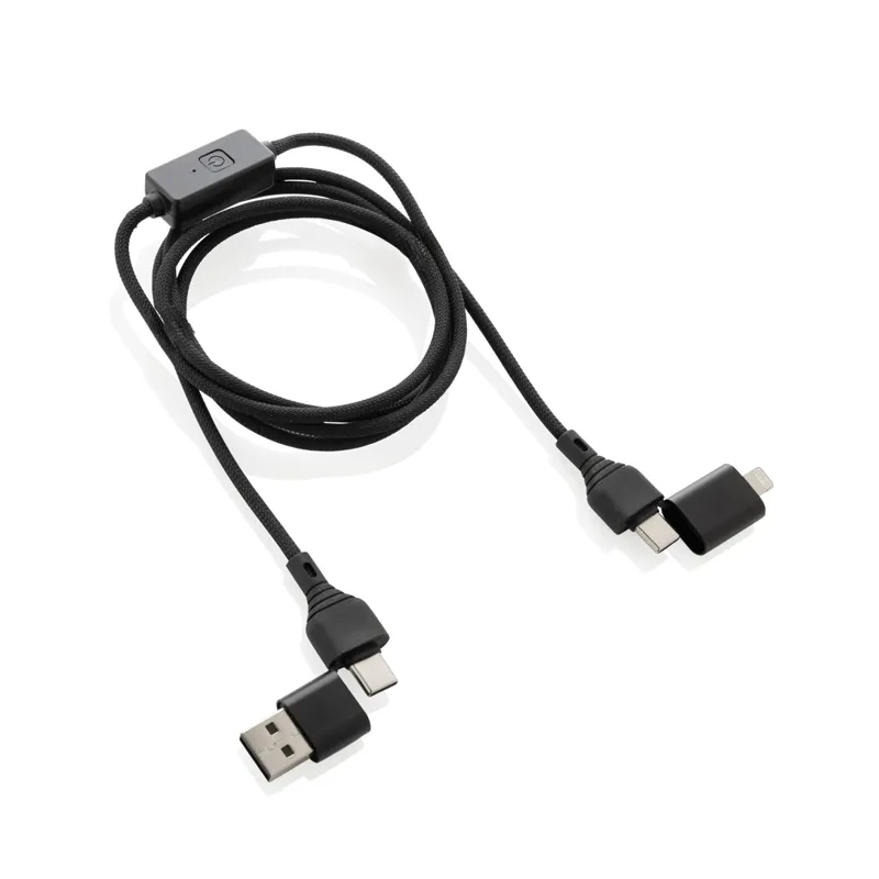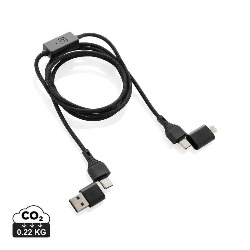 60W-os töltő- és adatkábel, ami minden mobileszközt csúcssebességgel tud tölteni és még a laptopok töltését is támogatja. Egyedi integrált gombbal az adatátviteli funkció kikapcsolásához ha a kábelt nyilvánosan használja, hogy elkerülje az adatlopást vagy a hekkerek hozzáférését a telefonhoz. A védelmi üzemmód aktiválásához egyszerűen nyomja meg a gombot. Újrahasznosított TPE-ből, PET-ből, ABS-ből és újrahasznosított alumíniumból készült. 120 cm hosszú és támogatja az autós lejátszást és az Android készülékeket (csak C típusú - C típusú). Teljes újrahasznosított anyagtartalom: 52% a termék összsúlya alapján. Az RCS-tanúsítvány biztosítja az újrahasznosított anyagok ellátási láncát. FSC mix csomagolásban. PVC-mentes.