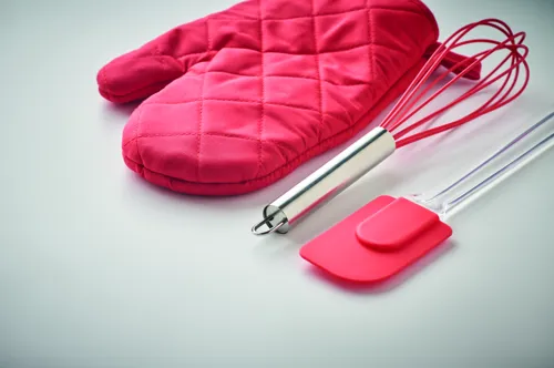Sütő kellék készlet. Tartalmaz egy 95% poliészter és 5% pamut kevert szálas anyagból készült konyhai edényfogó kesztyűt, kézi habverőt, valamint szilikon spatulát.