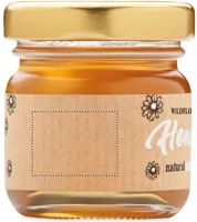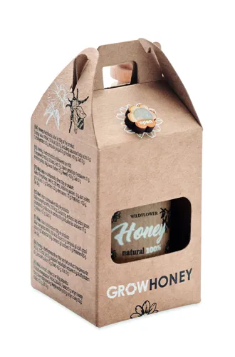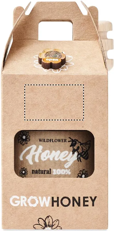 Vadvirágméz üvegben (50 g) fából készült mézcsurgatóval. Kraftpapír dobozban. Méhlegelő virágmagokkal együtt. EU-ban készült.