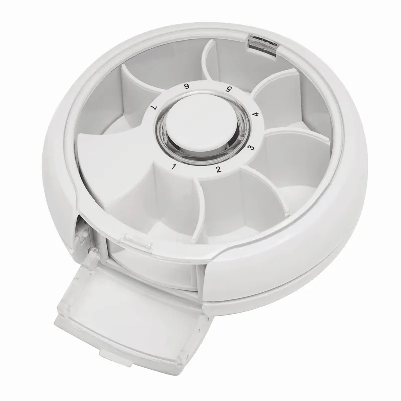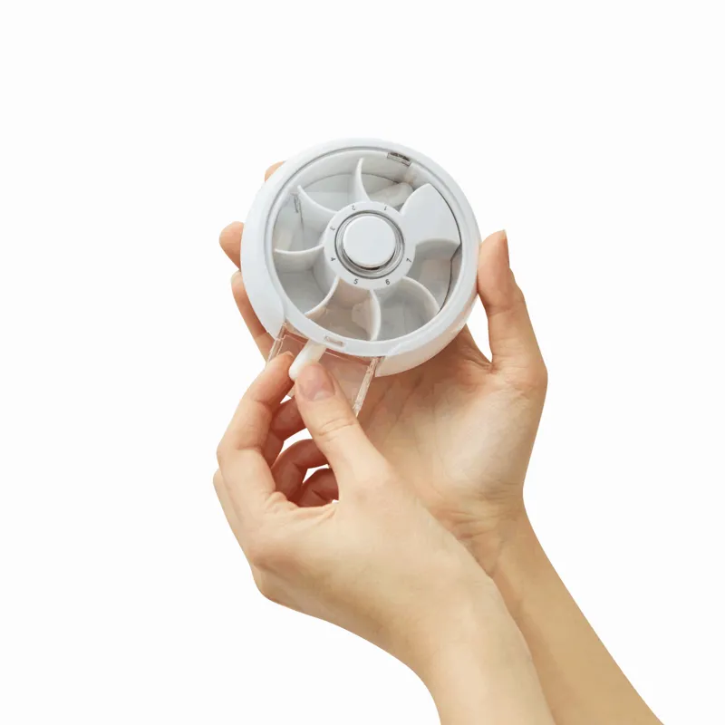 DAY BY DAY gyógyszertároló 7 rekesszel, forog, amikor megnyomja a gombot, átlátszó ajtó a gyógyszer kivételéhez