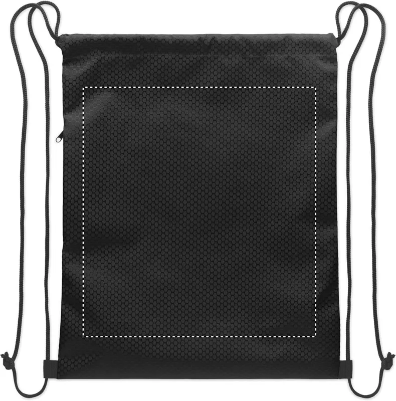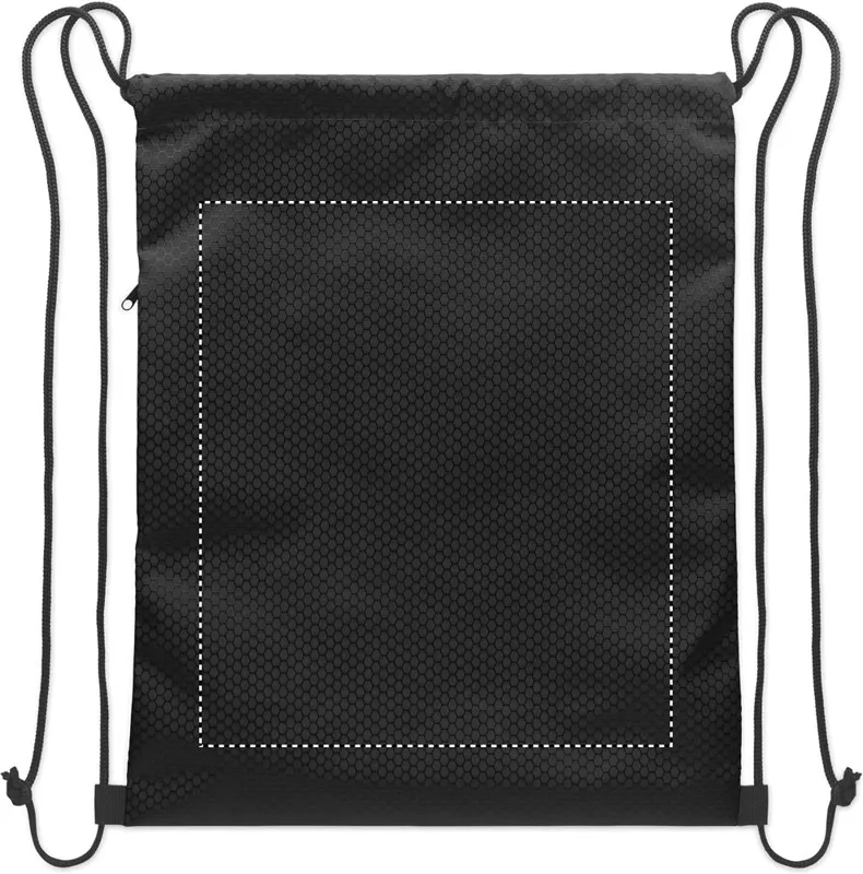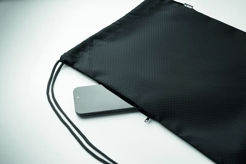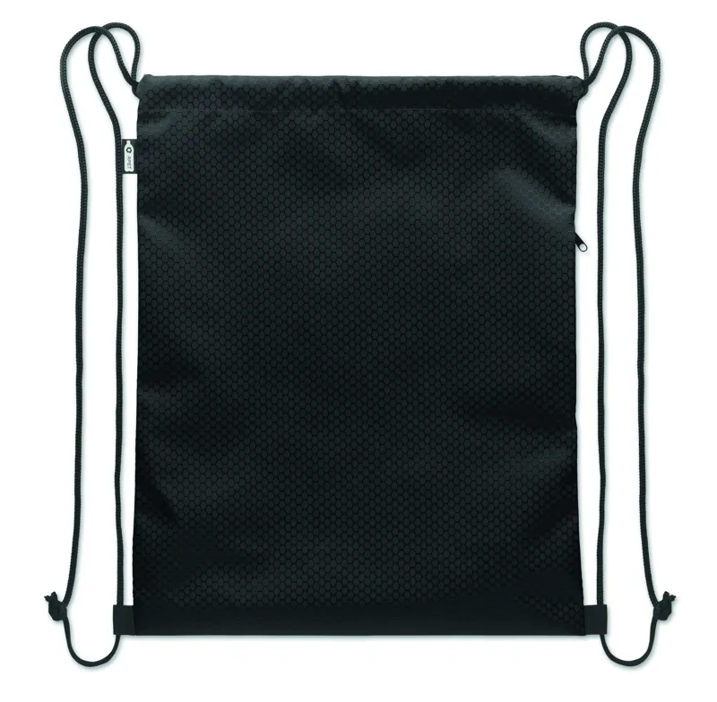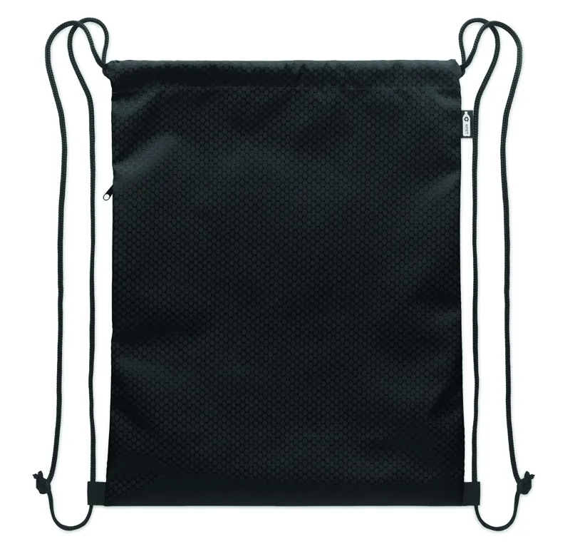 Húzózsinóros táska 420D RPET poliészterből, függőleges oldalsó cipzáras zsebbel, 210D RPET béléssel. Tartós zsinórokkal mindkét oldalon. Kapacitás: 4,5 l, maximális teherbírás: 5 kg.