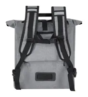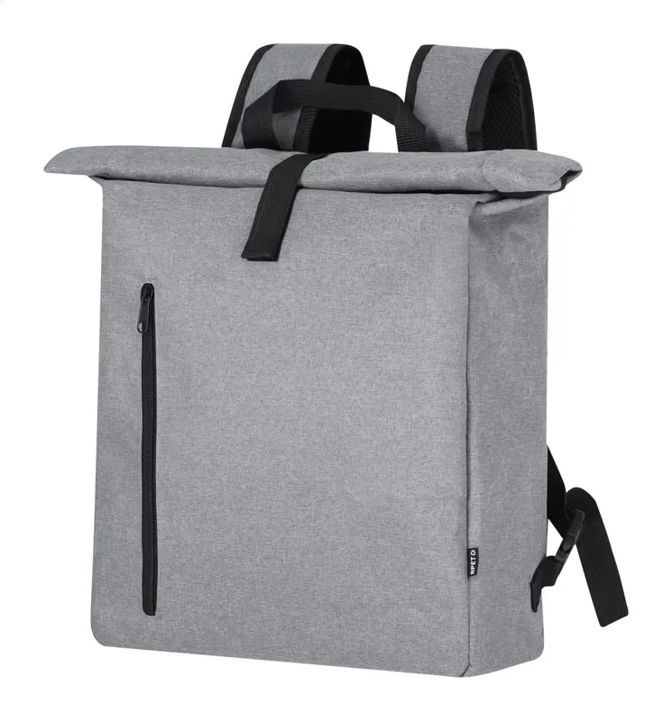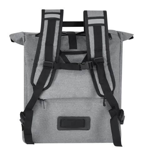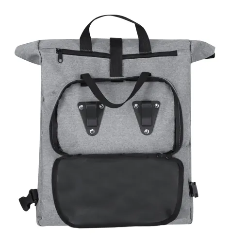 600D RPET poliészter kerékpáros hátizsák cipzáras első zsebbel és levehető, párnázott vállpántokkal. Rejtett keretrögzítő bilincsekkel.