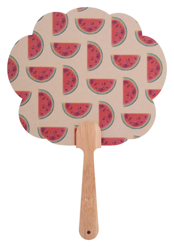 Kraft papírból készült, egyediesíthető legyező, bambusz nyéllel. A papír rész mindkét oldalon egyedi grafikával készül. Minimális rendelési mennyiség: 100 db.